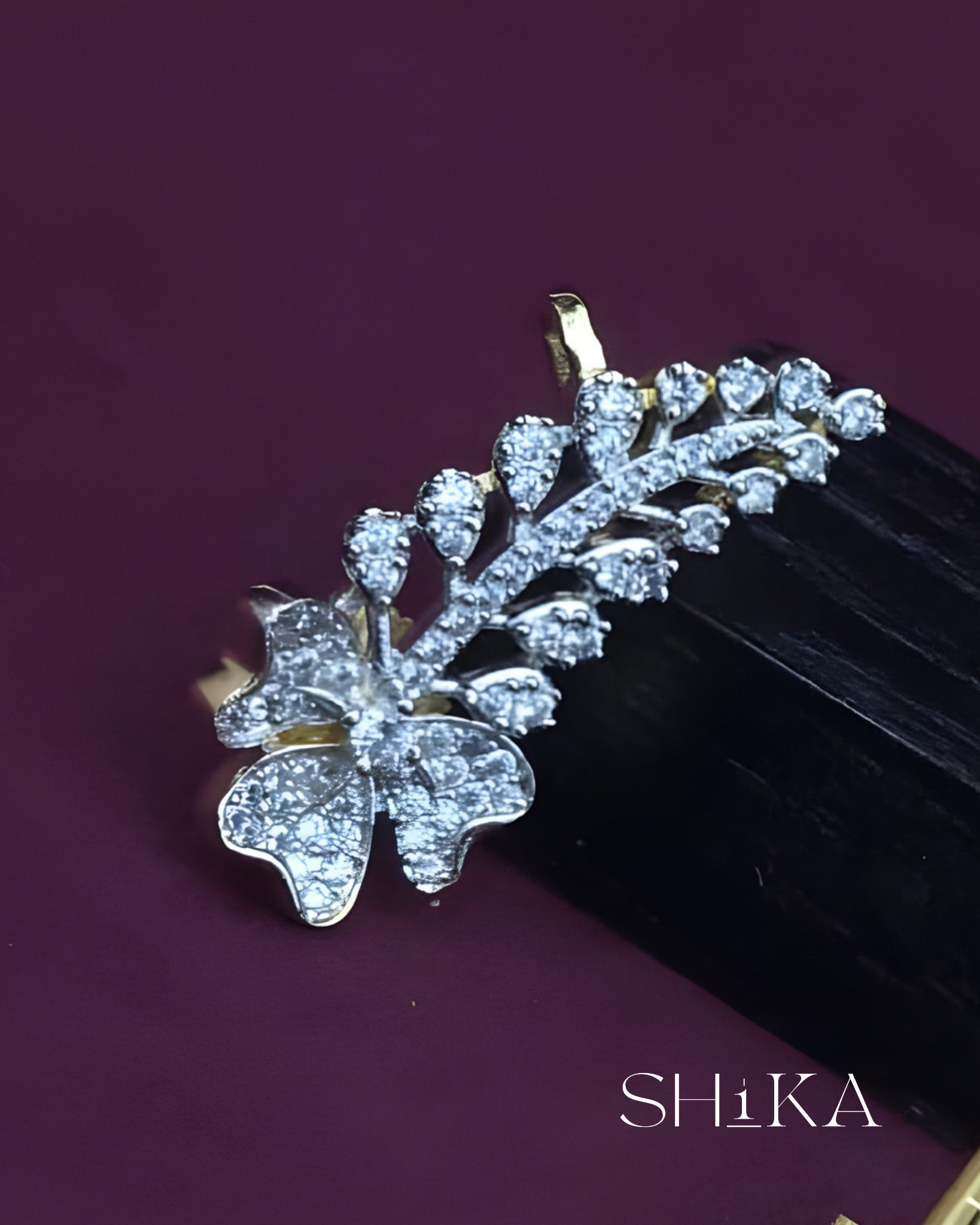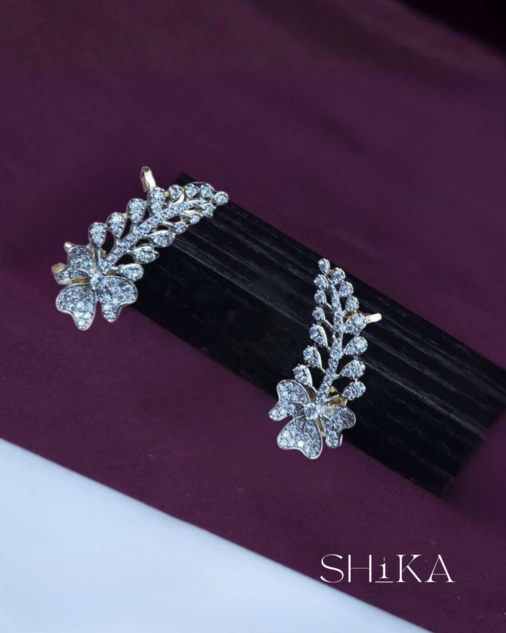 A graceful pair of ear cuffs featuring a floral base and cascading leaf-like elements adorned with diamond-like stones. These earrings offer a luxurious finish for bridal or evening ensembles.