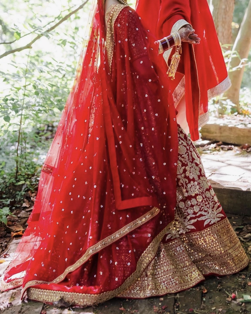 A timeless bridal silhouette, this classic red lehenga is richly adorned with intricate gold zari embroidery throughout, making it a stunning choice for a wedding ceremony or traditional bridal events. The detailed floral motifs and heavily embellished border reflect heritage craftsmanship while maintaining an elegant, regal presence. The lehenga is paired with a coordinating blouse and a sheer red dupatta, finished with an ornate gold border that drapes beautifully over the shoulder or head. Together, the ensemble creates a striking yet graceful bridal look that photographs beautifully and feels truly special for the big day. Size: S (owner is 5’1)