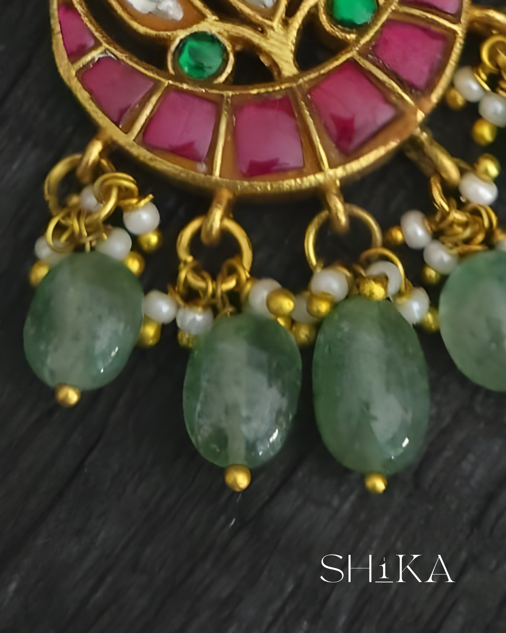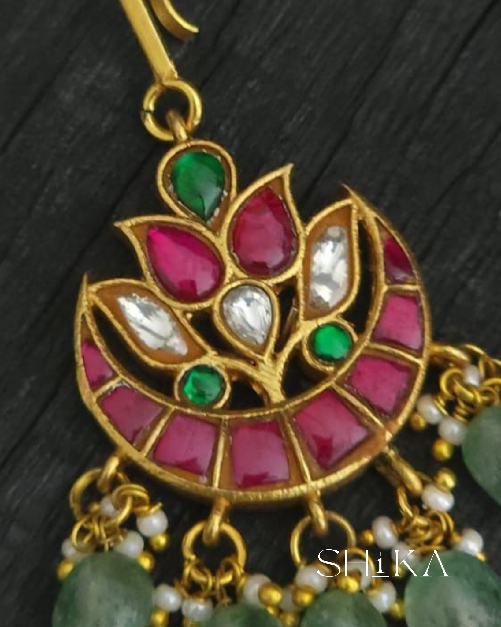 A delicate crescent-shaped tika adorned with red, green, and white stones in a floral arrangement. Green bead drops and pearl accents complete the look, ideal for festive and bridal wear.