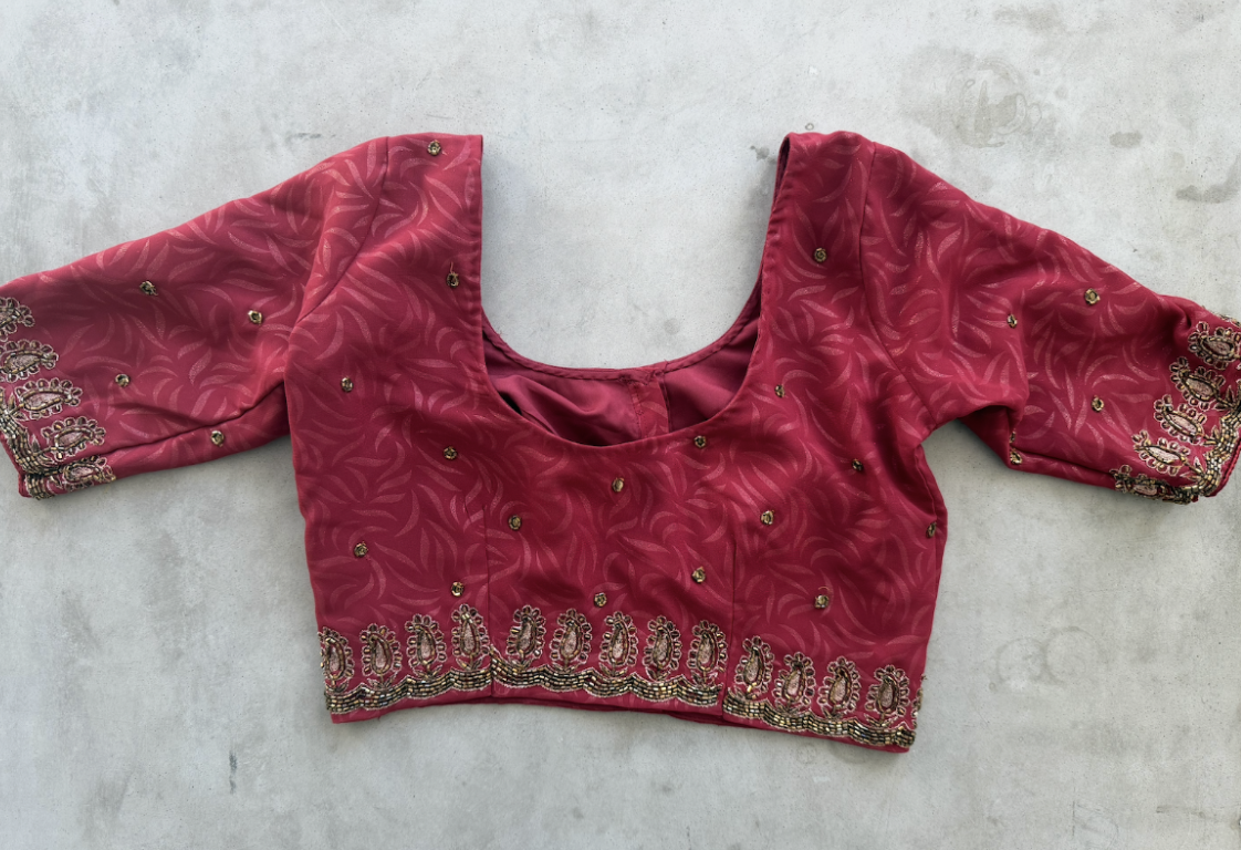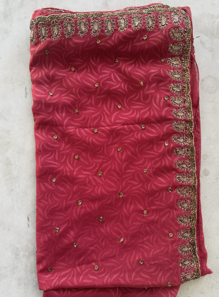 A rich deep-rose saree with an elegant tonal leaf pattern woven/printed throughout, finished with a detailed gold embellished border for a classic festive glow. Scattered with tiny gold accents across the body that catch the light beautifully without feeling overdone. Includes the matching blouse shown with coordinating border work on the sleeves and hem. Perfect for weddings, festive dinners, and special occasions when you want something timeless, feminine, and easy to style with gold jewelry.