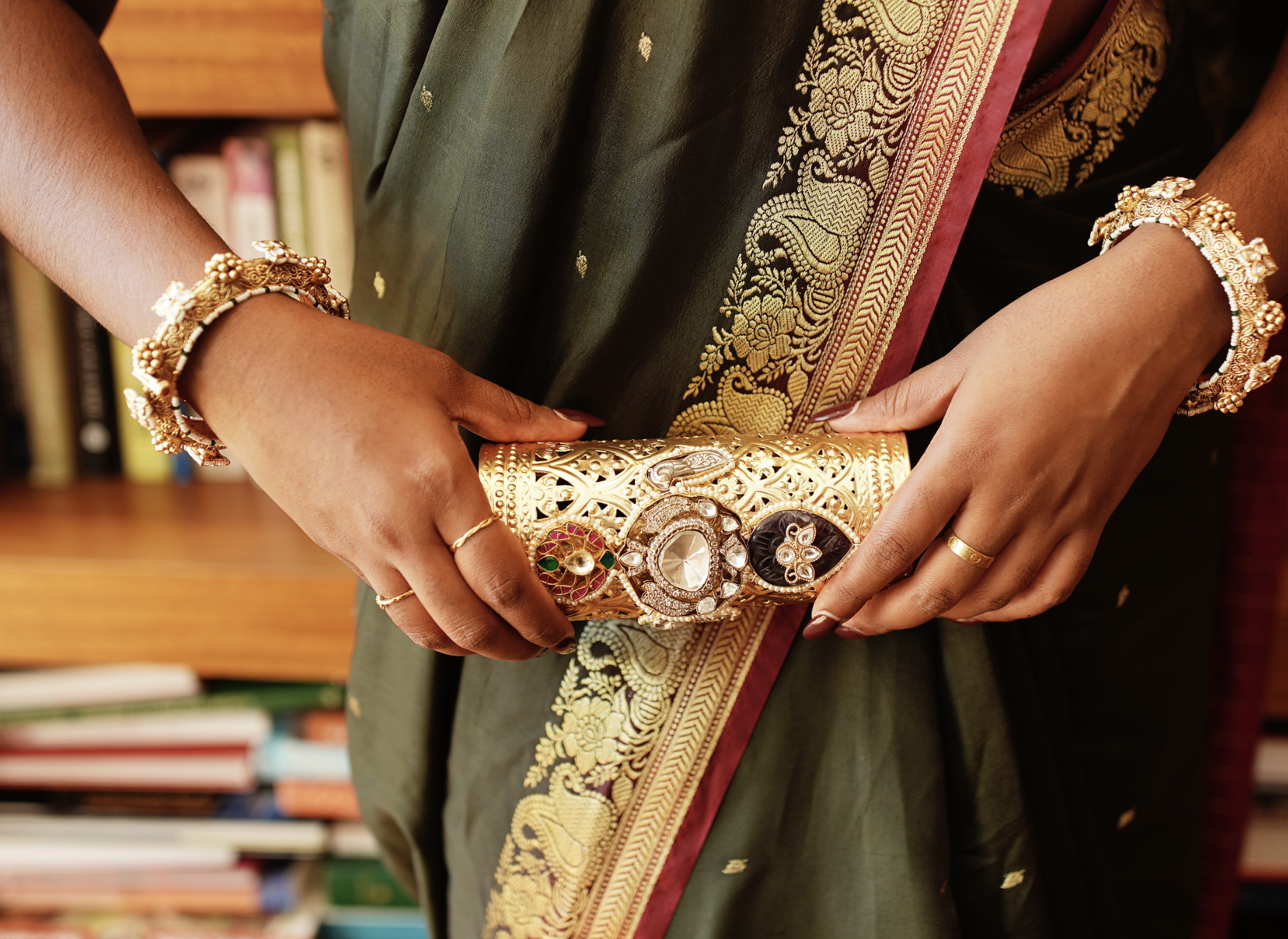 A rich dark silk saree detailed with subtle gold butis and a traditional maroon-gold zari border. The fabric has a natural sheen that elevates its timeless appeal, while the contrasting blouse adds structure and depth. A refined pick for weddings, receptions, or festive gatherings where understated luxury stands out.