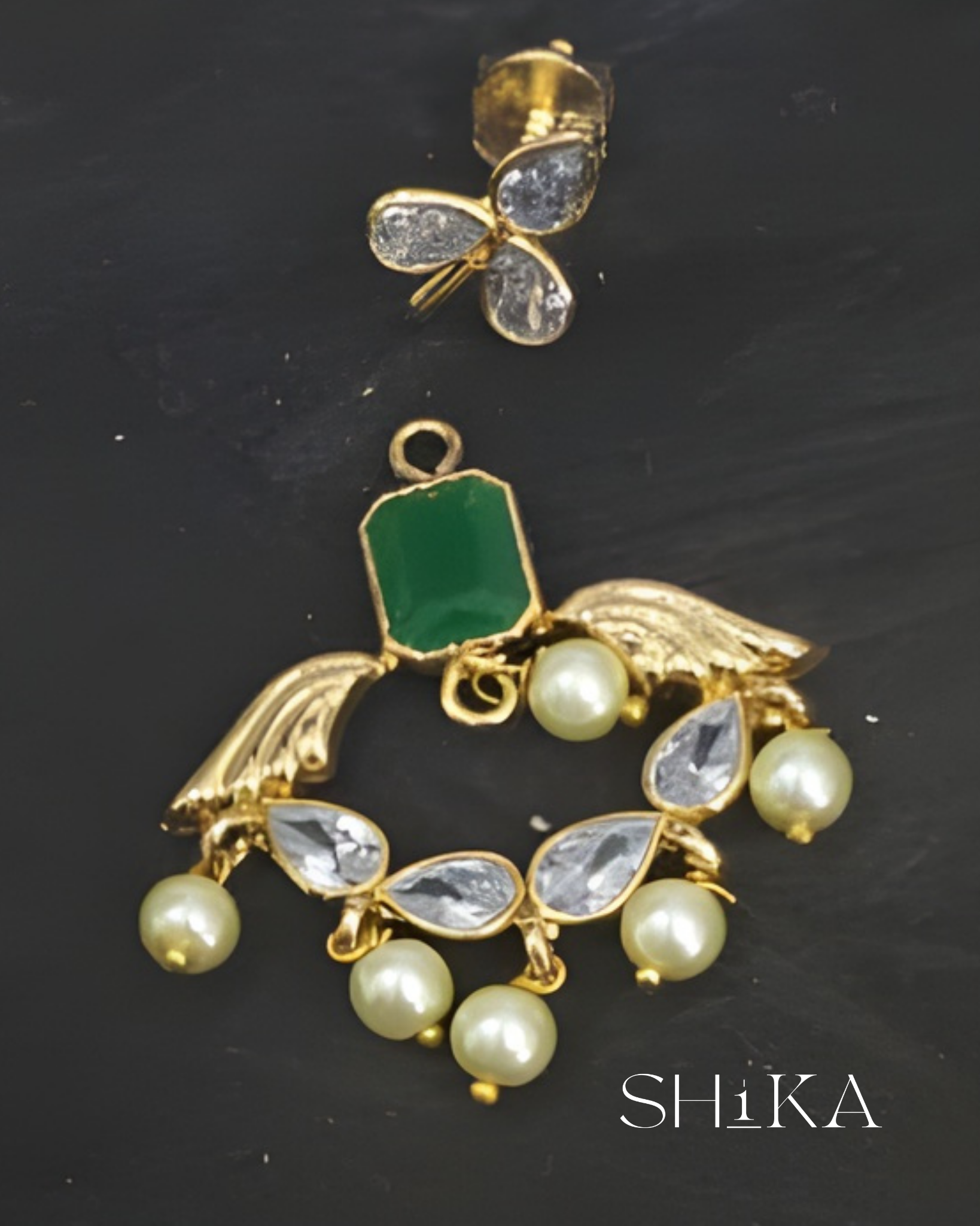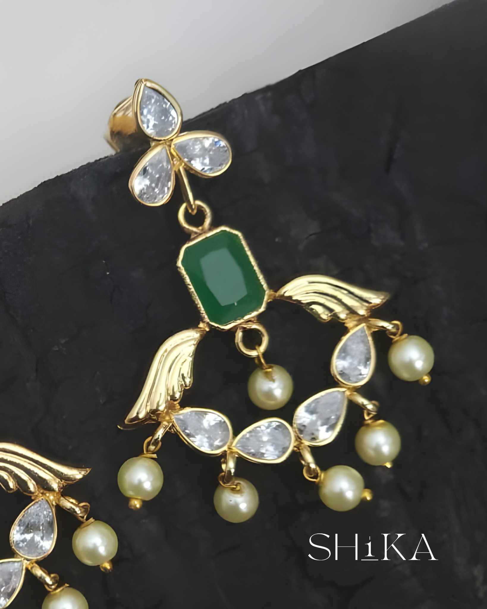 A versatile 2-in-1 earring set that blends sophistication with smart design. These detachable earrings feature a bold red or green stone centerpiece, framed by teardrop CZs and pearl accents. Ideal for weddings or festive wear, with the option to wear as elegant studs or statement drops.