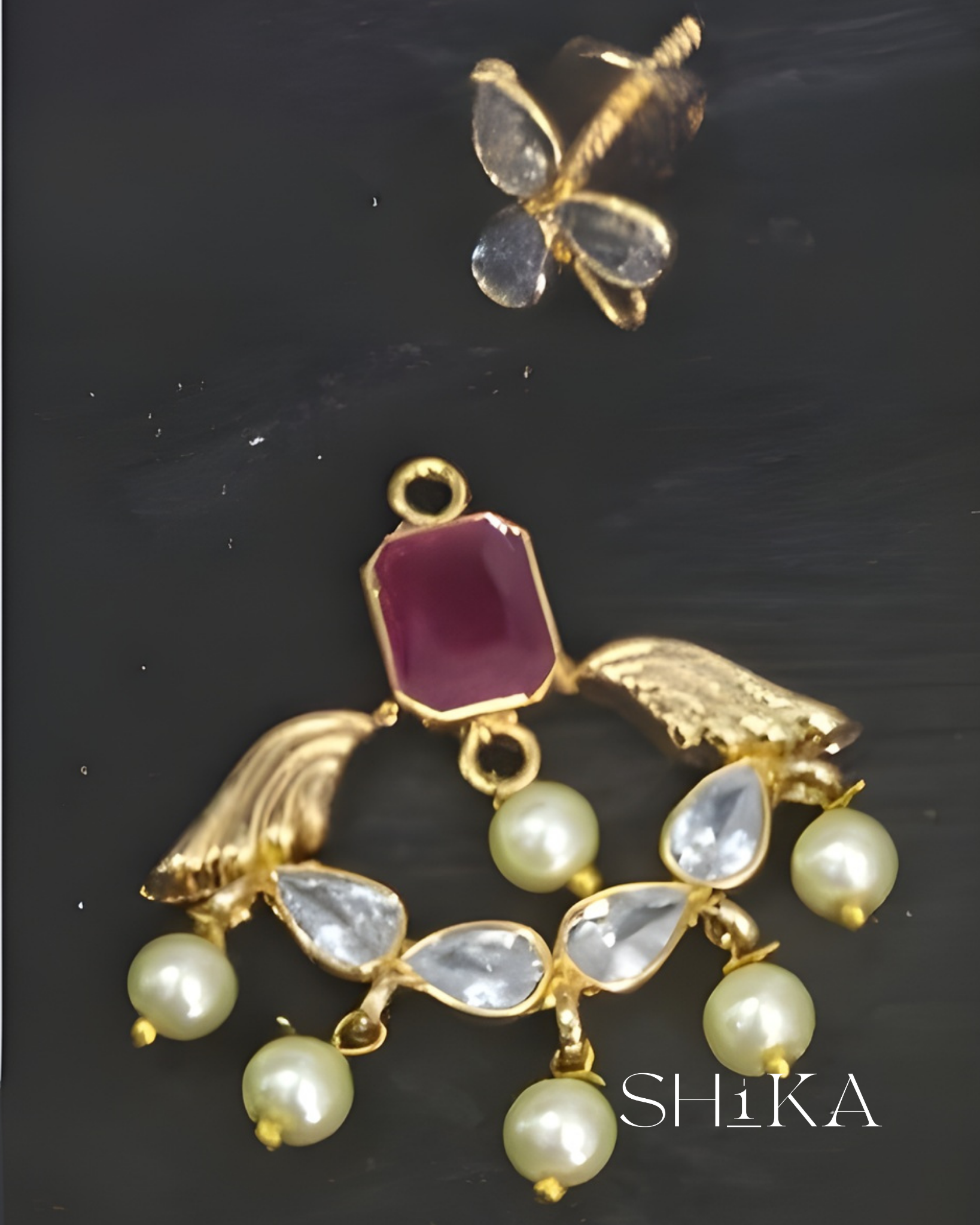A versatile 2-in-1 earring set that blends sophistication with smart design. These detachable earrings feature a bold red or green stone centerpiece, framed by teardrop CZs and pearl accents. Ideal for weddings or festive wear, with the option to wear as elegant studs or statement drops.