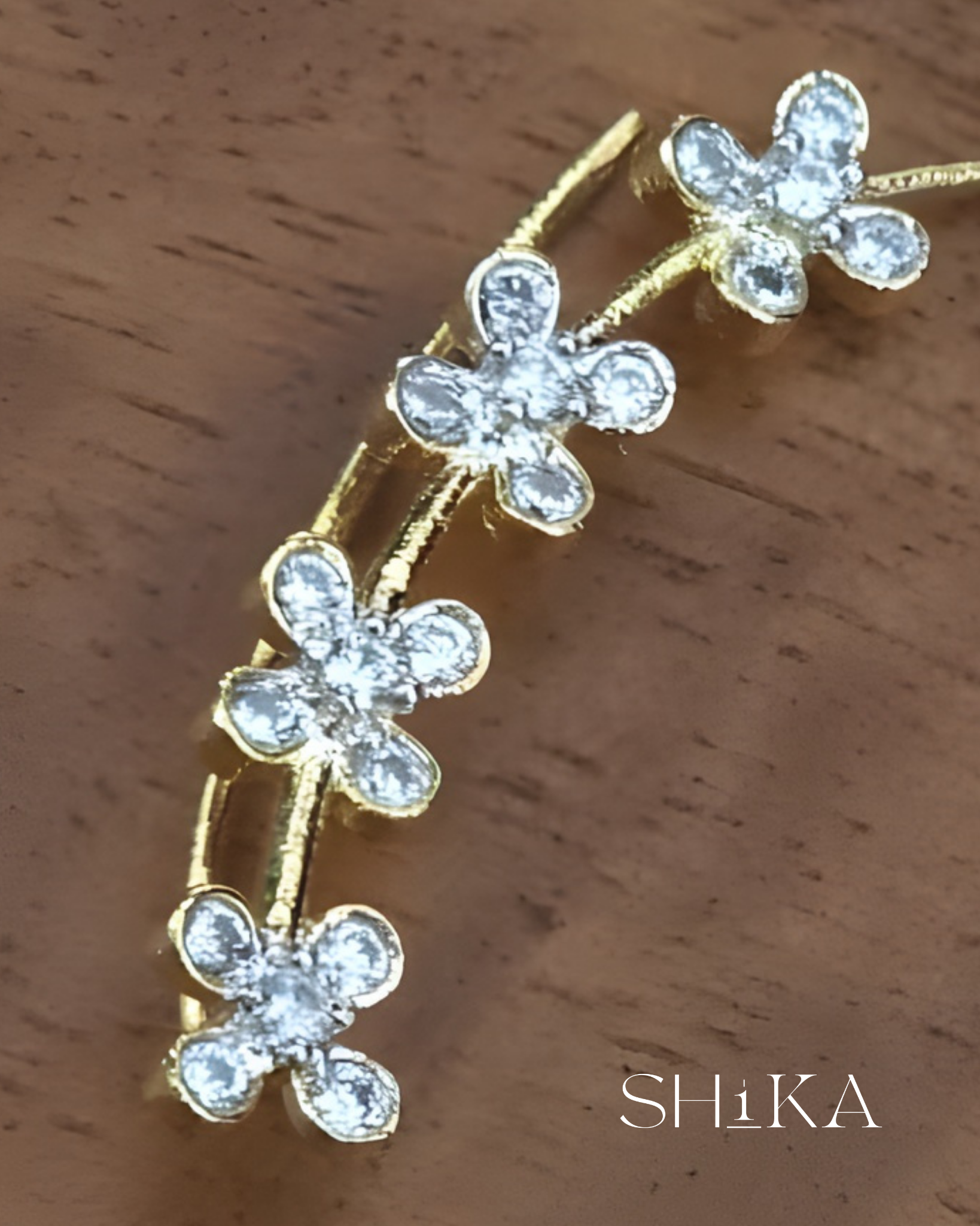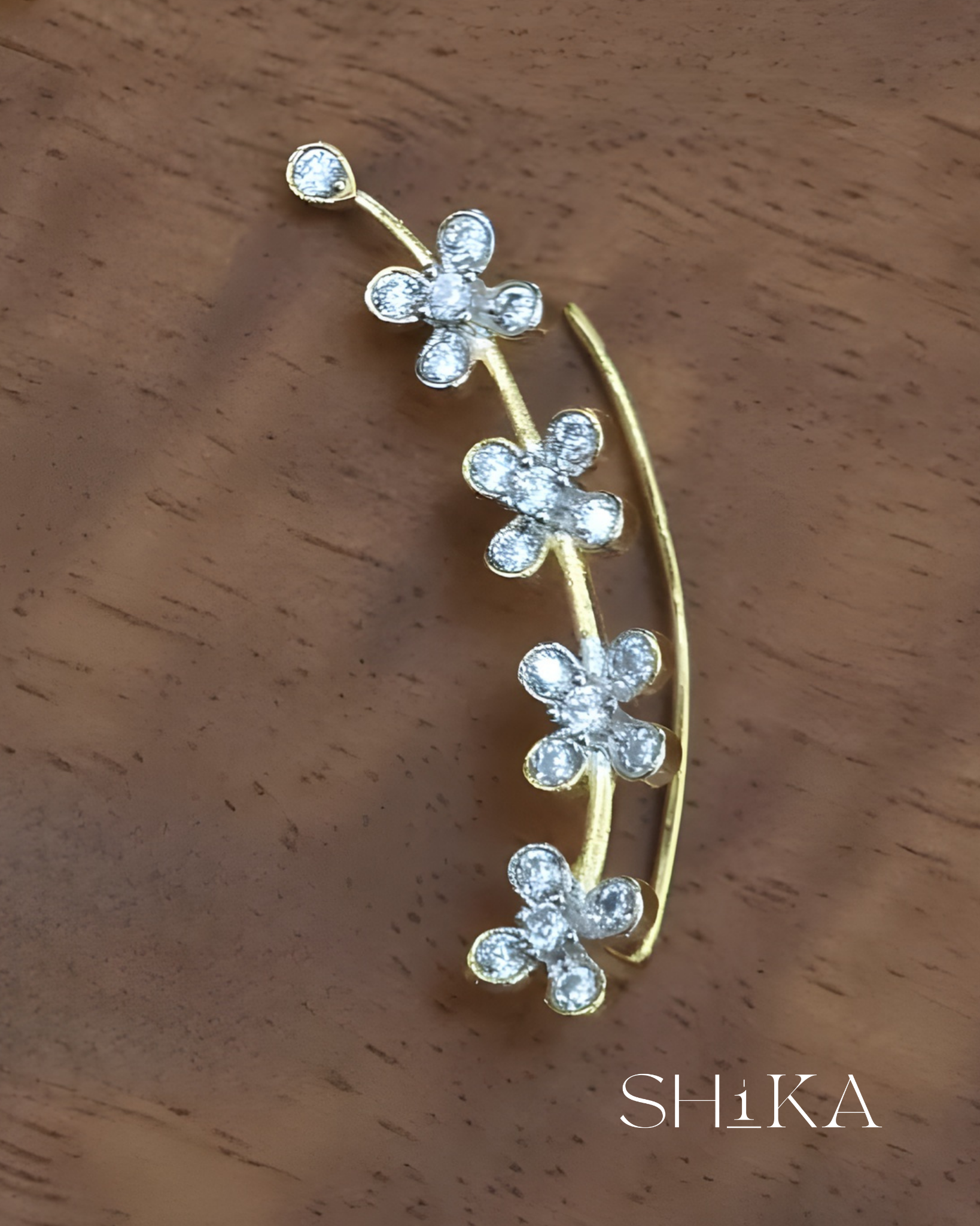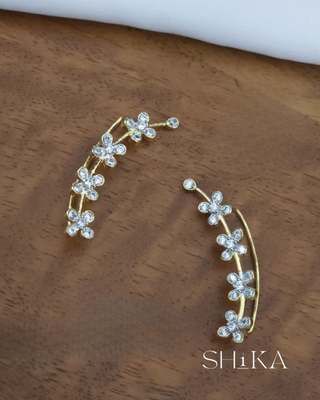 A delicate pair of ear cuffs featuring floral motifs and shimmering diamond-like stones. The curved silhouette adds elegance to festive and formal looks, making them a versatile addition to your jewelry box.