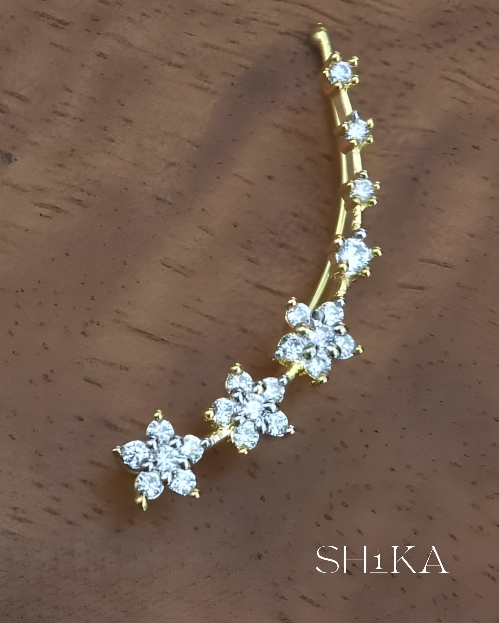 A delicate pair of ear cuffs featuring star motifs and shimmering diamond-like stones. The curved silhouette adds elegance to festive and formal looks, making them a versatile addition to your jewelry box.