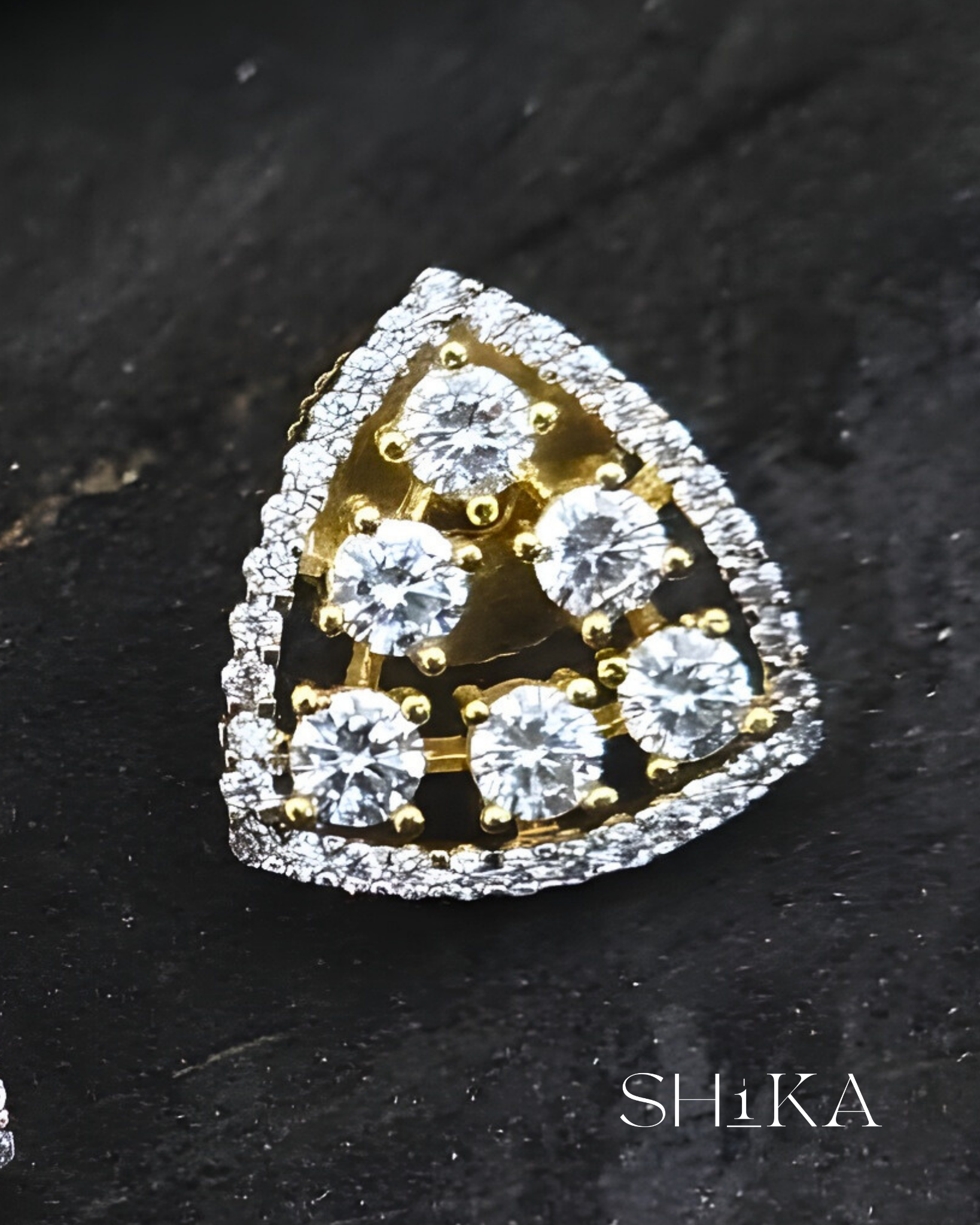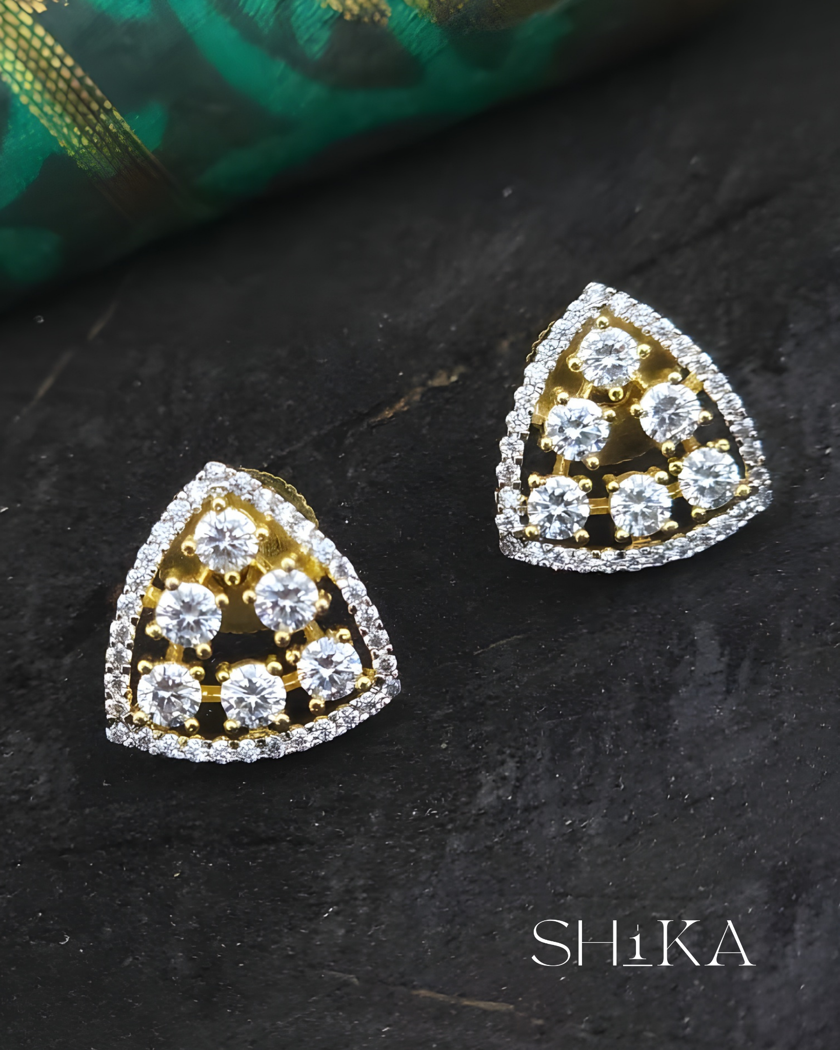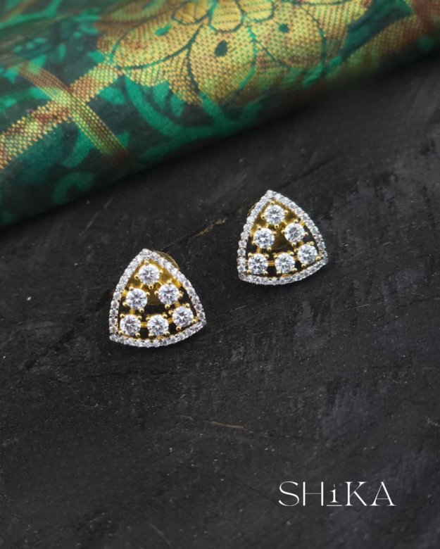 A sleek pair of triangular studs that blend modern geometry with classic sparkle. Embellished with high-quality CZ stones in a symmetrical layout, these earrings are perfect for elegant daywear or festive evenings.