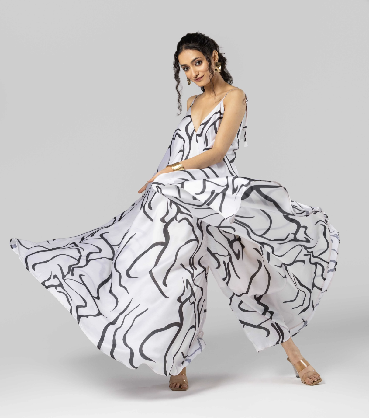The Go With the Flow Jumpsuit is movement in clothing form. Based on our bestselling Mirror Mirror jumpsuit silhouette, it features a wide-leg shape, deep V neckline, and breezy drape that moves with you. The abstract black-on-white print adds visual rhythm, while the lightweight fabric keeps it effortless and airy.