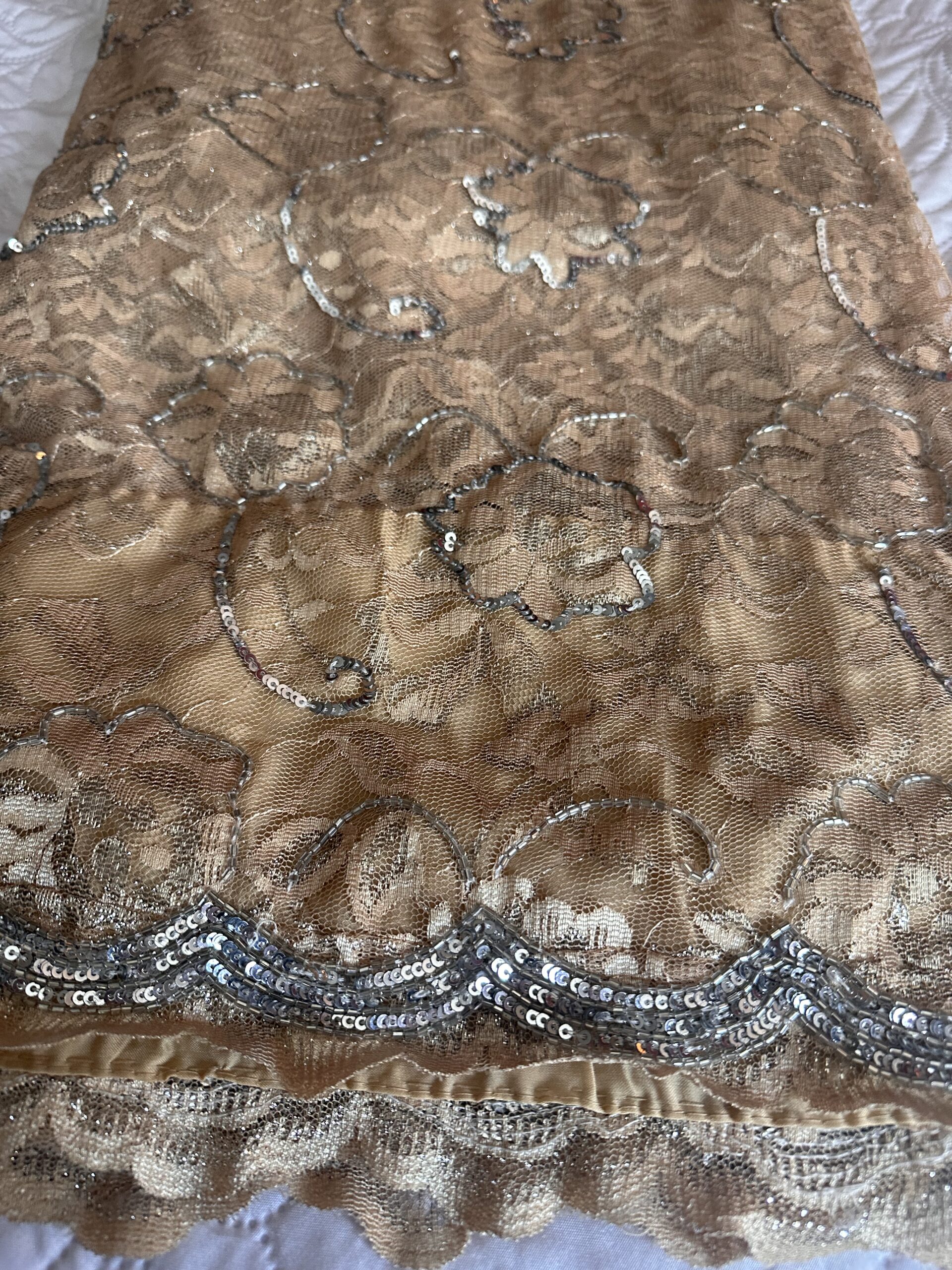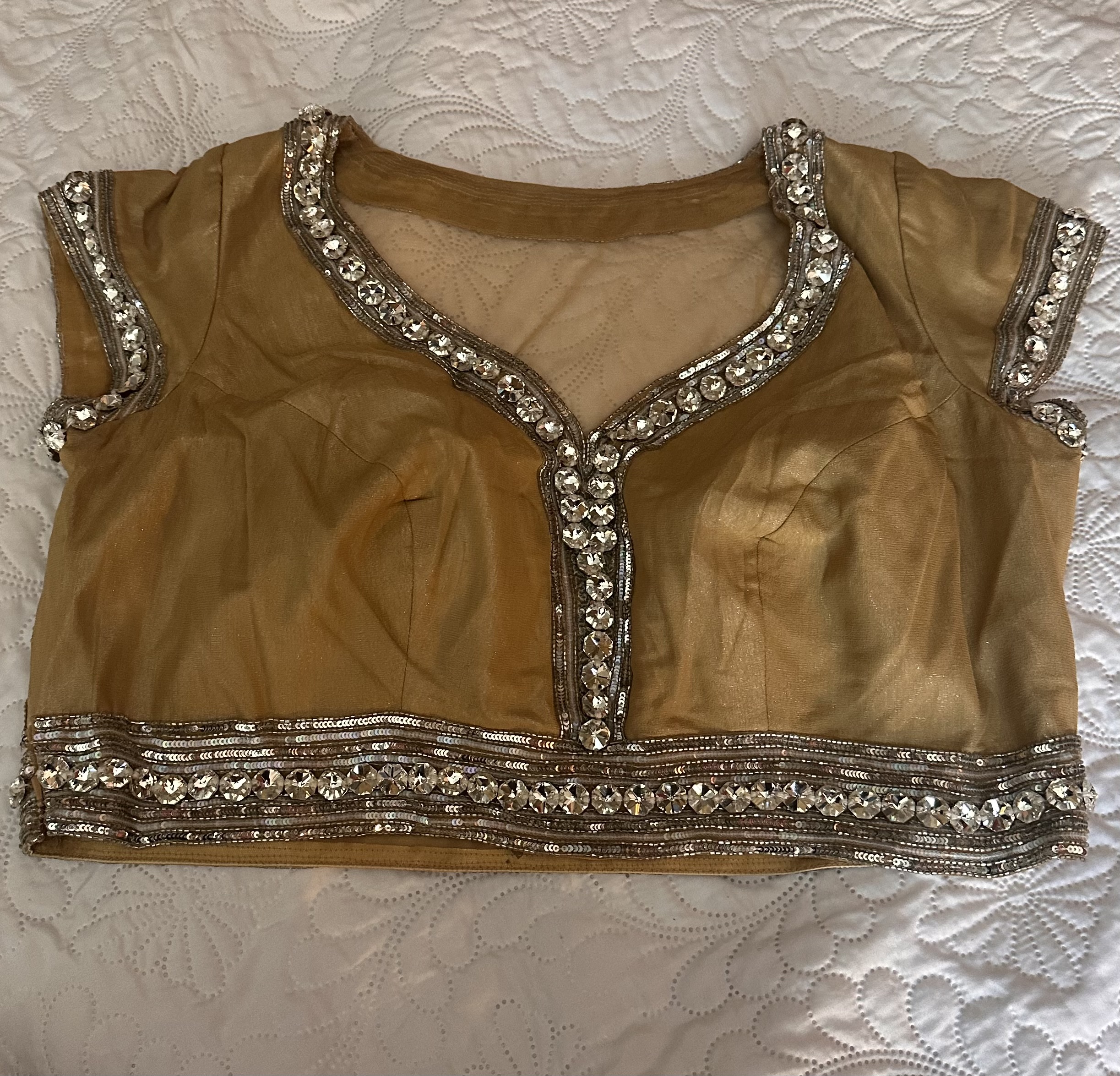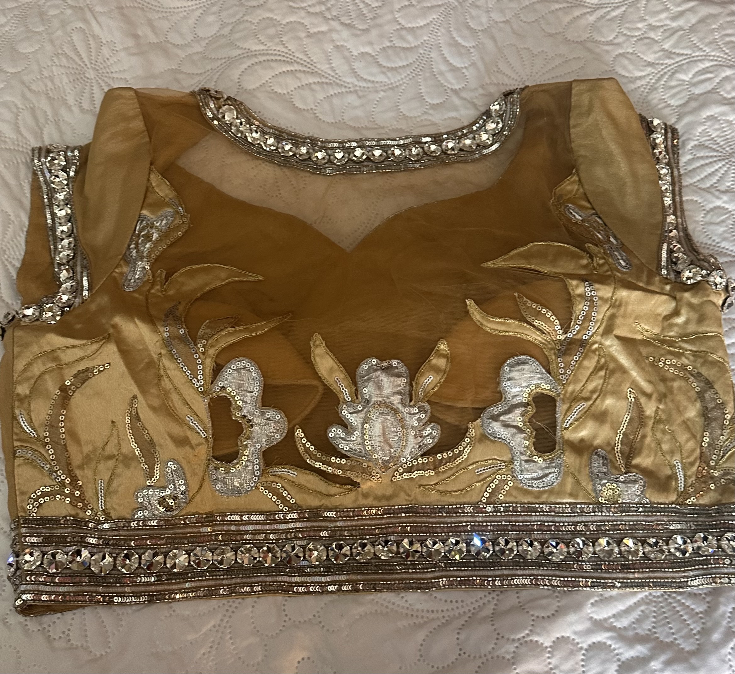 Be the first to review “Gold Chantilly Lace Sari with bead work and sequin embroidery. Heavy crystal work blouse and petticoat included.”