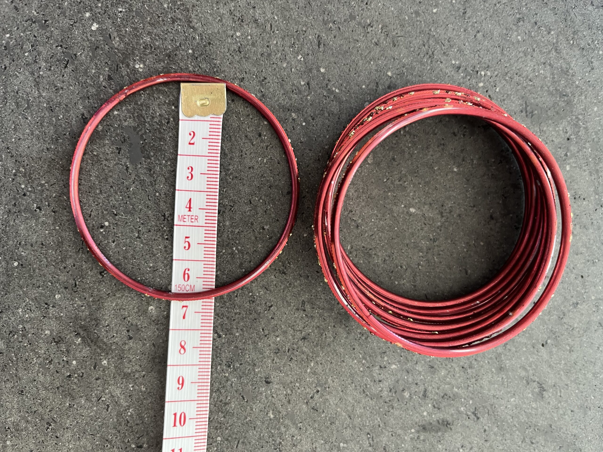 Add a touch of elegance to any outfit with this set of 10 pre-loved bangles in a rich maroon shade, accented with delicate gold speckling. Perfect for stacking or pairing with festive and traditional looks.