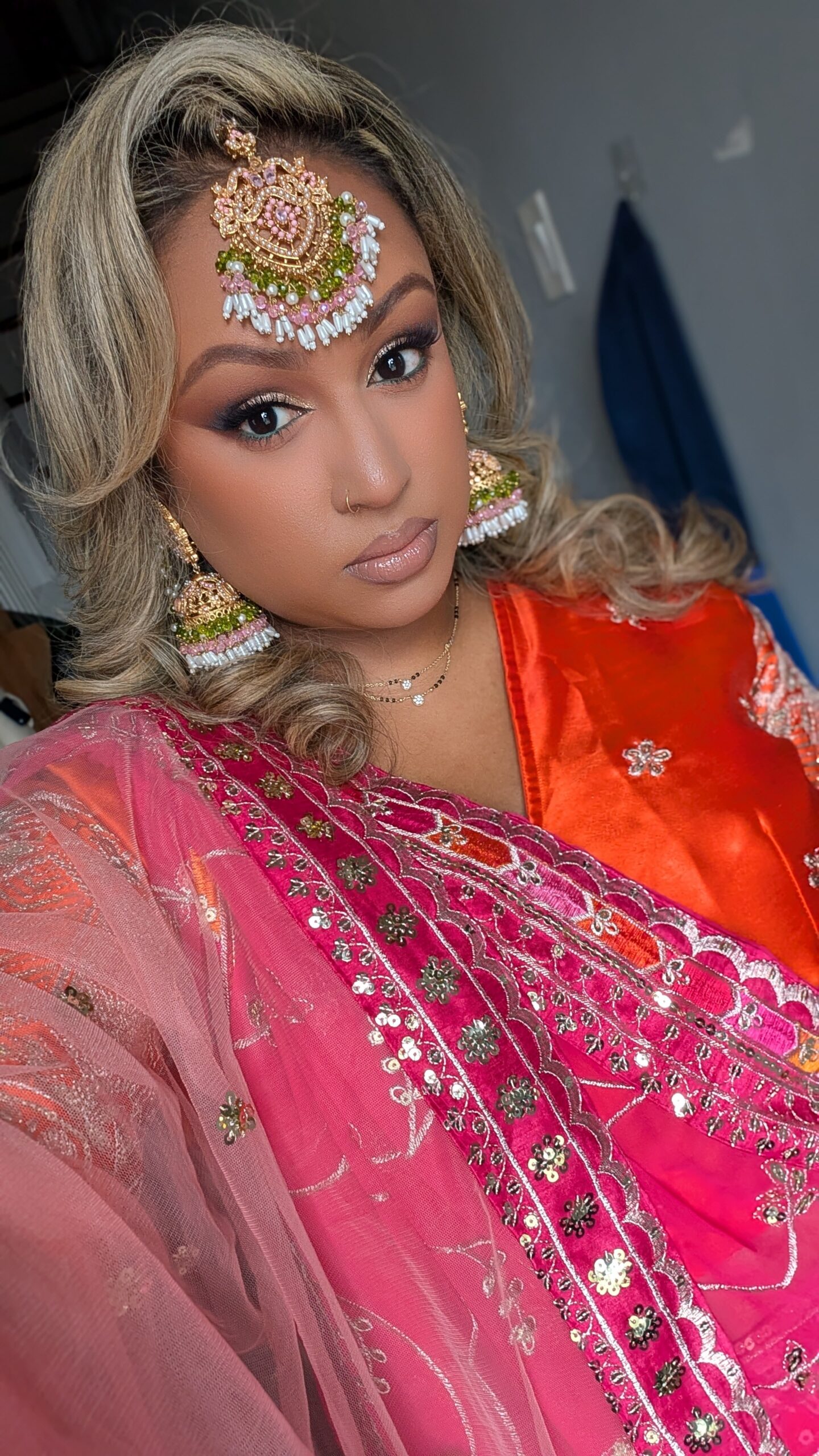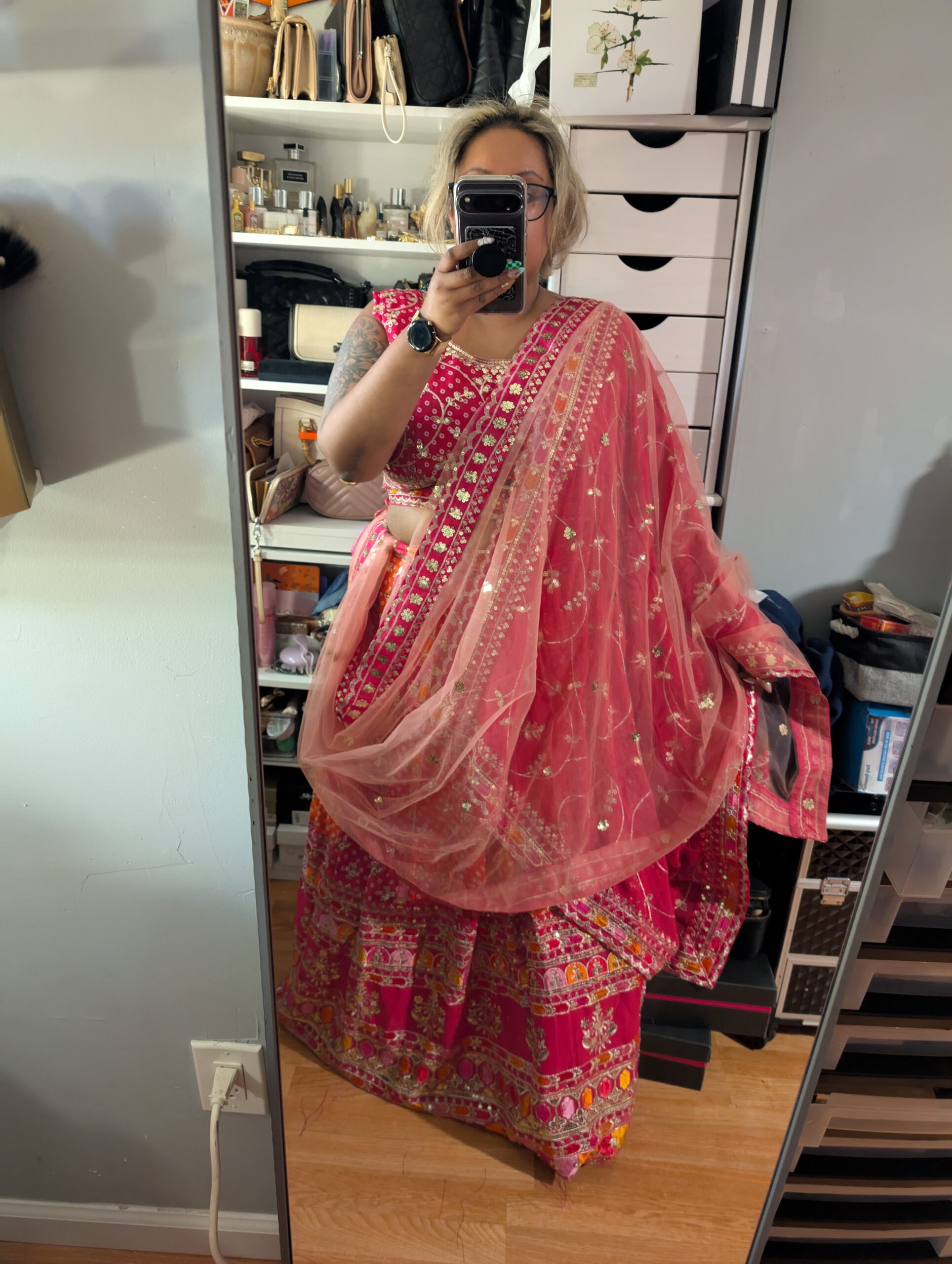 Vibrant and eye-catching, this hot pink embroidered lehenga set features intricate floral threadwork and colorful border detailing that adds richness and dimension to the design. Paired with a soft peach sheer dupatta adorned with delicate embellishments, the ensemble creates a beautiful contrast while maintaining an elegant, festive look—perfect for weddings, receptions, and celebratory occasions.