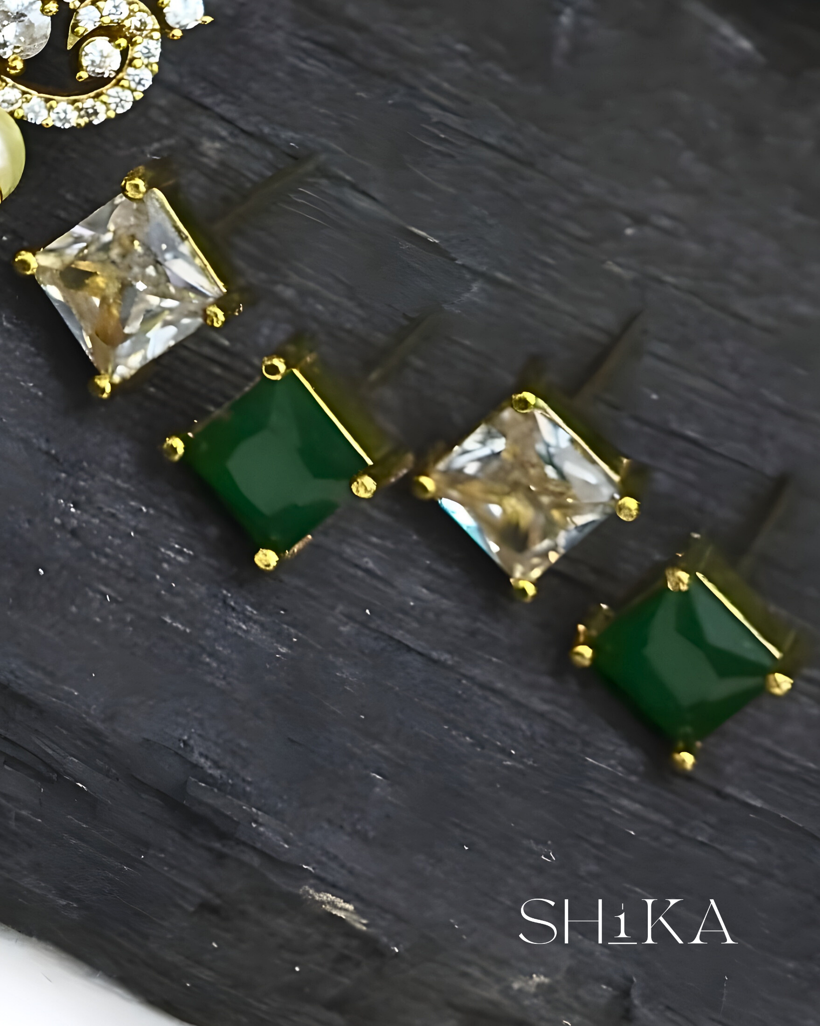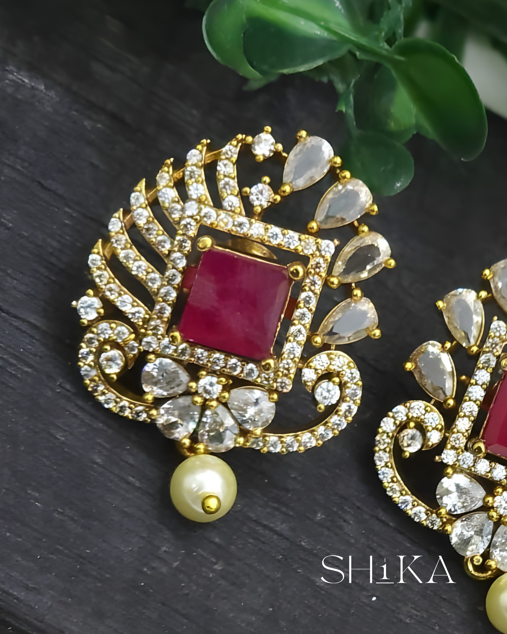 A dazzling pair of earrings that offer versatility and charm. Featuring a peacock-inspired motif with a central square gemstone, these earrings come with interchangeable red, green, and clear stones to suit any occasion. Embellished with CZs and a pearl drop, they’re perfect for weddings and festive celebrations.
