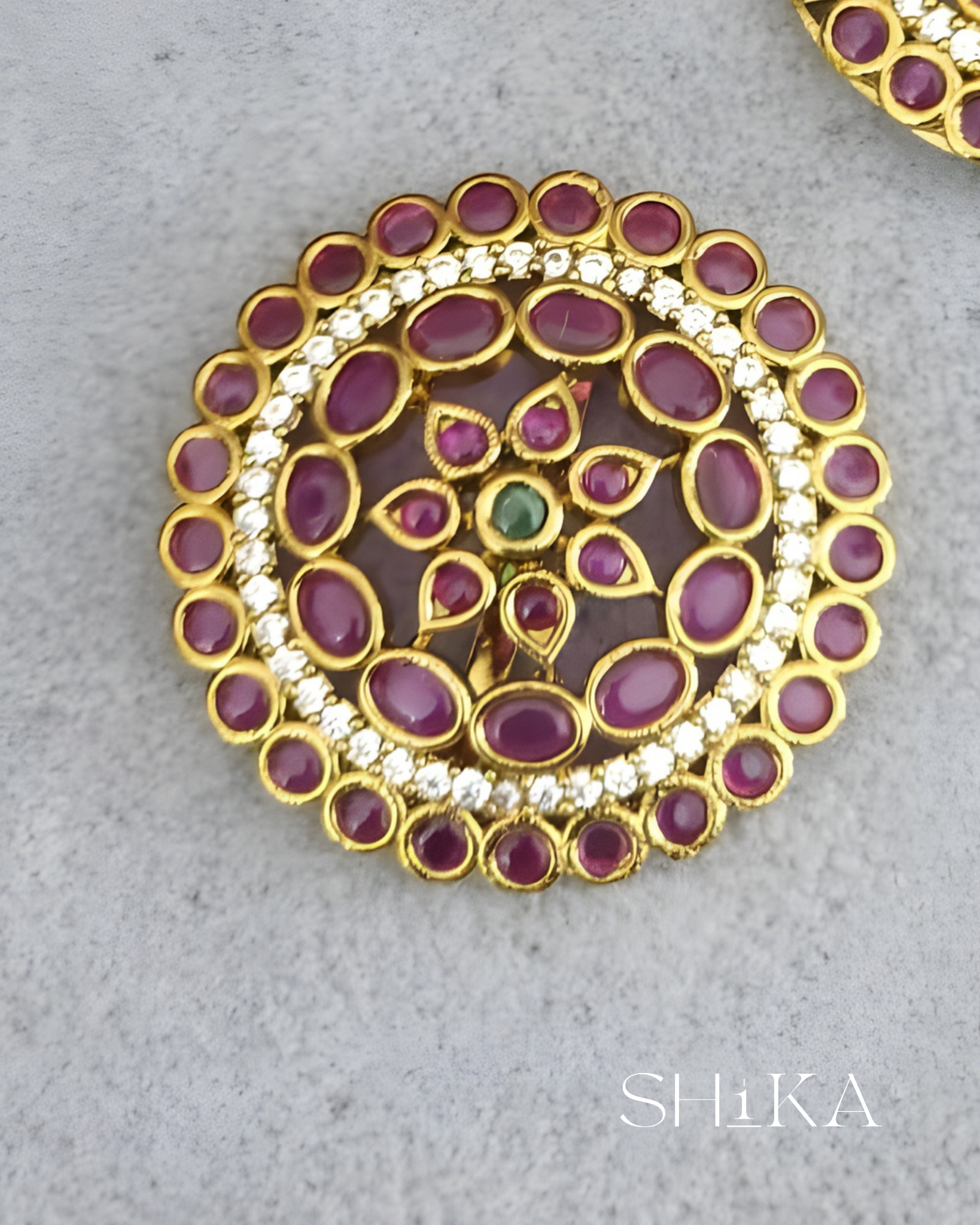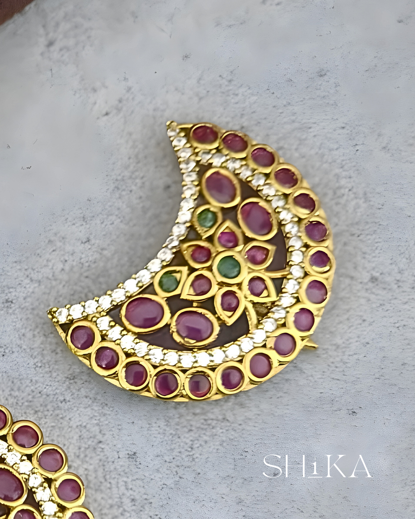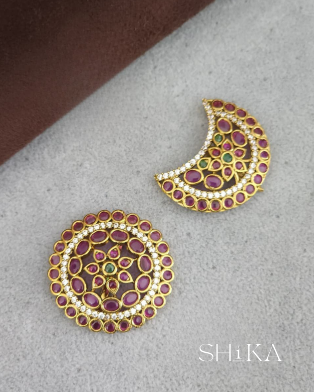 A vibrant pair of kempu-inspired hair accessories symbolizing cosmic harmony. The sun design features a central green stone surrounded by red and white accents, while the moon mirrors this palette in a graceful crescent. Ideal for temple wear or bridal styling.