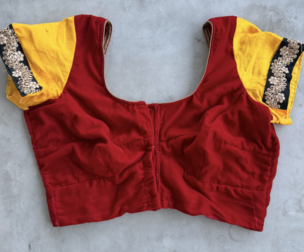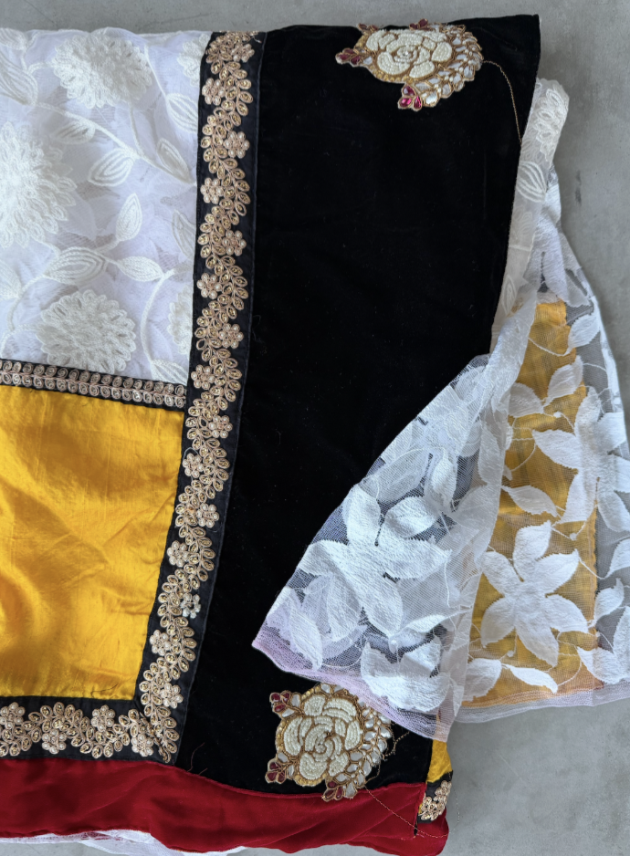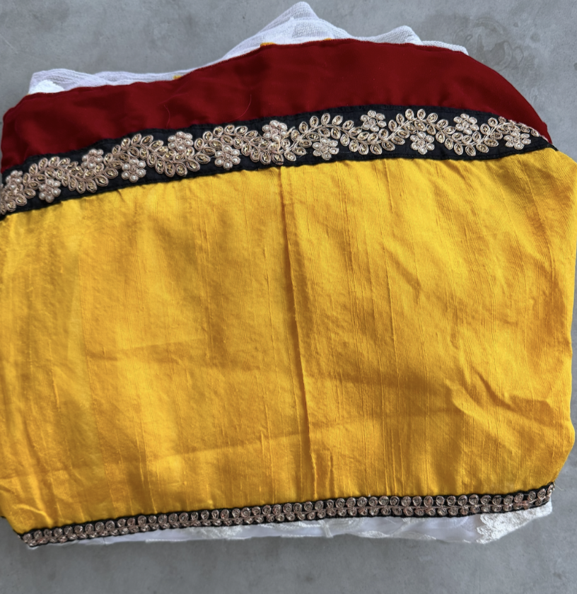 A bold color-block saree featuring a vibrant mustard yellow body paired with a sleek black panel and a sheer white floral lace section for an elevated, modern contrast. Finished with a red edging and a black border detailed with gold floral embellishment for extra sparkle. Comes with the matching deep red blouse shown, with statement yellow sleeves and embellished trim. Perfect for festive events, mehndi nights, and parties when you want a unique, standout drape.