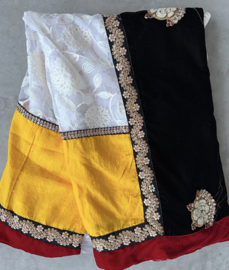Mustard Yellow, Black & White Saree with Floral Lace Panel + Matching Velvet Red Blouse