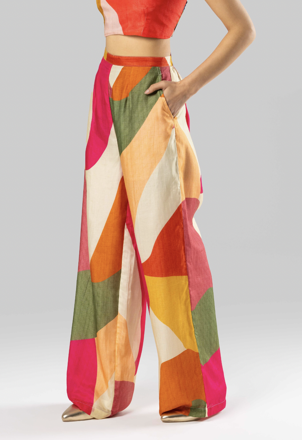 These full-length, high-waisted pants basically feel like pajamas, with a softly gathered waistband for shape and comfort. The wide-leg cut offers ease of movement, while the bold colorblock print adds visual impact.