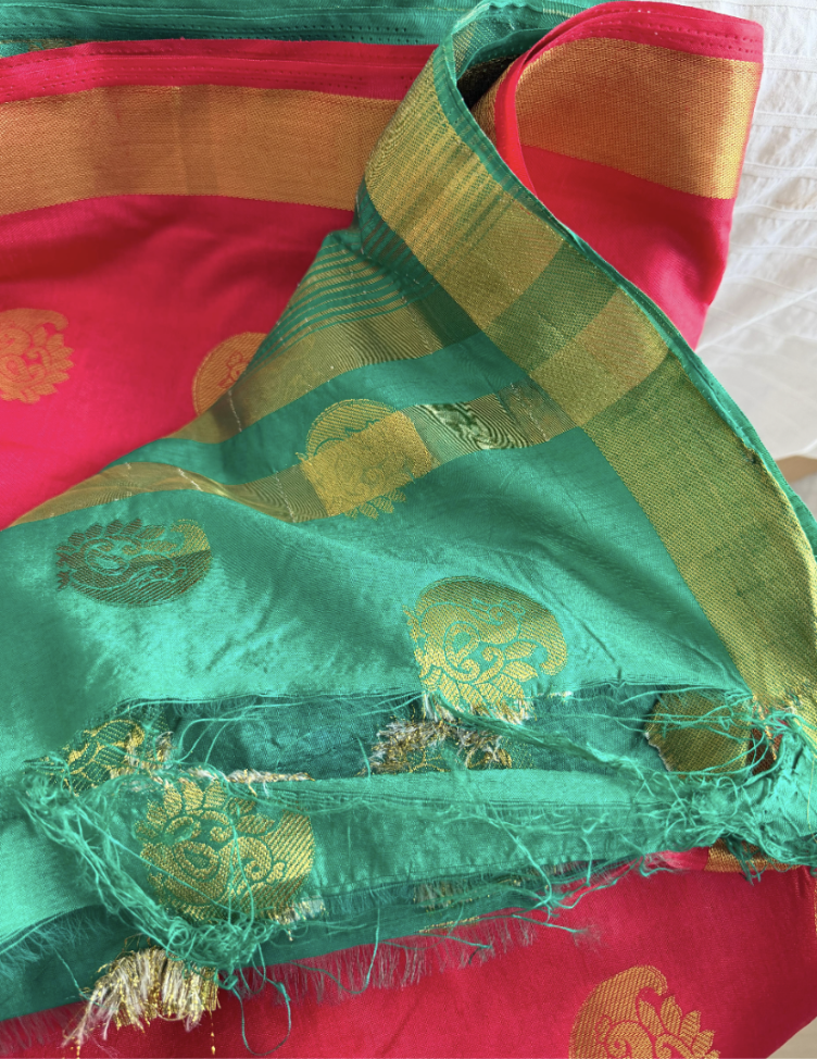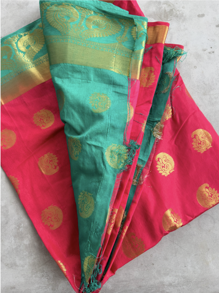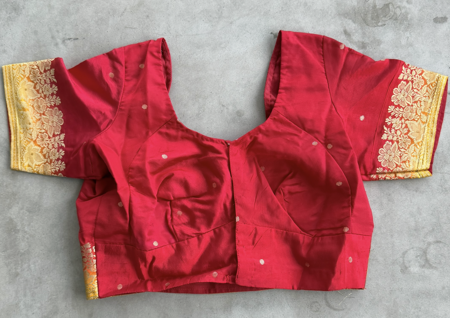 This bright red sari is woven with gold round motifs and finished with a rich green contrast border featuring traditional gold detailing. Includes the matching pink blouse shown, with gold brocade-style sleeve accents and subtle woven dot details throughout. Condition note: There is a tear near the bottom hem (see photos). Pricing has been adjusted accordingly, and it should be an easy fix for a tailor if desired or the material could be used for another outfit. On-model image is for styling reference and may not be exact.
