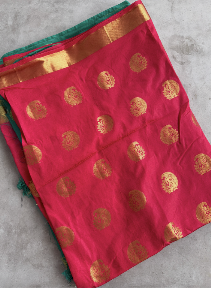 Rani Red & Green Sari Set — Gold Motifs, Temple-Style Border, Matching Blouse