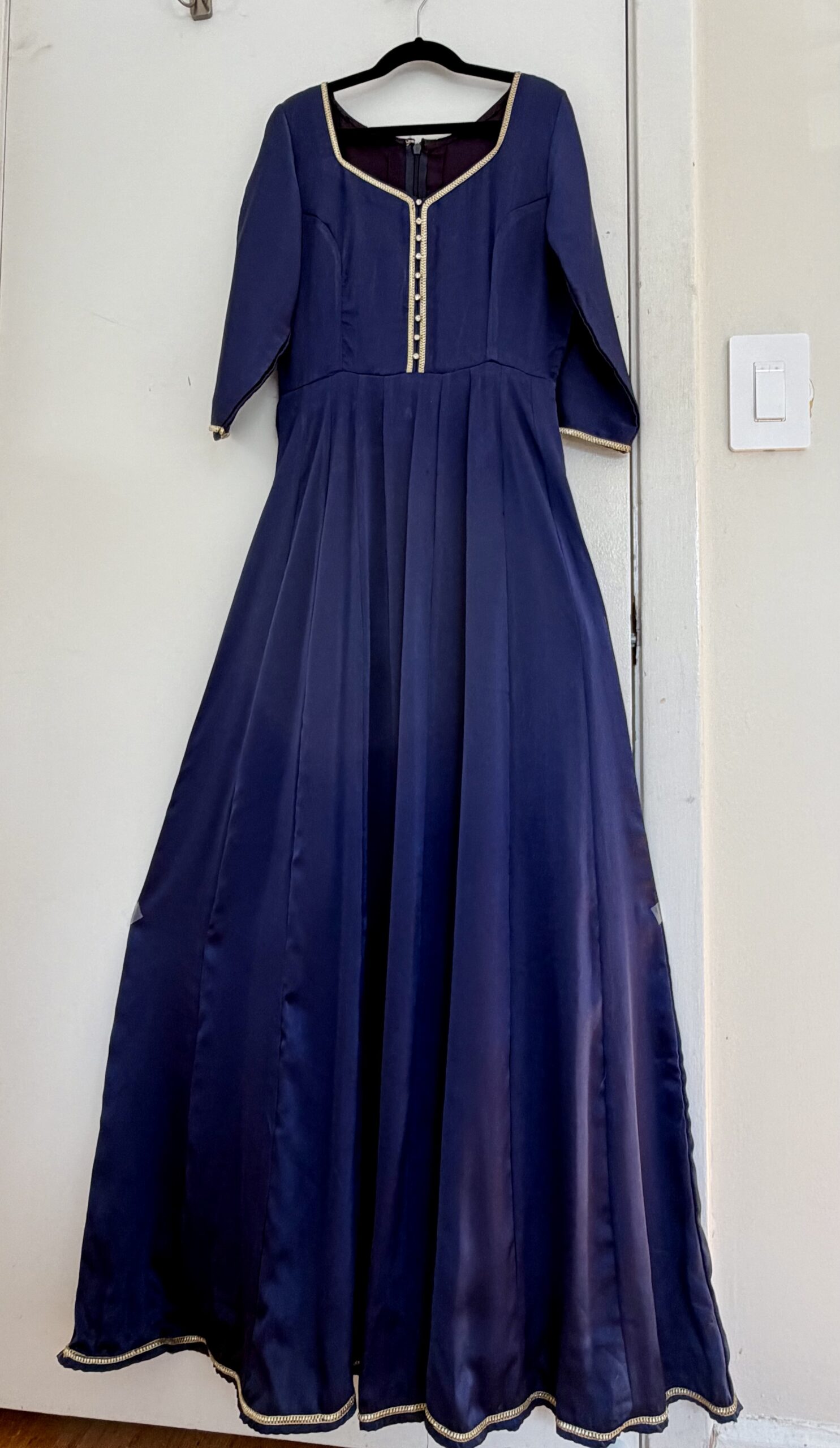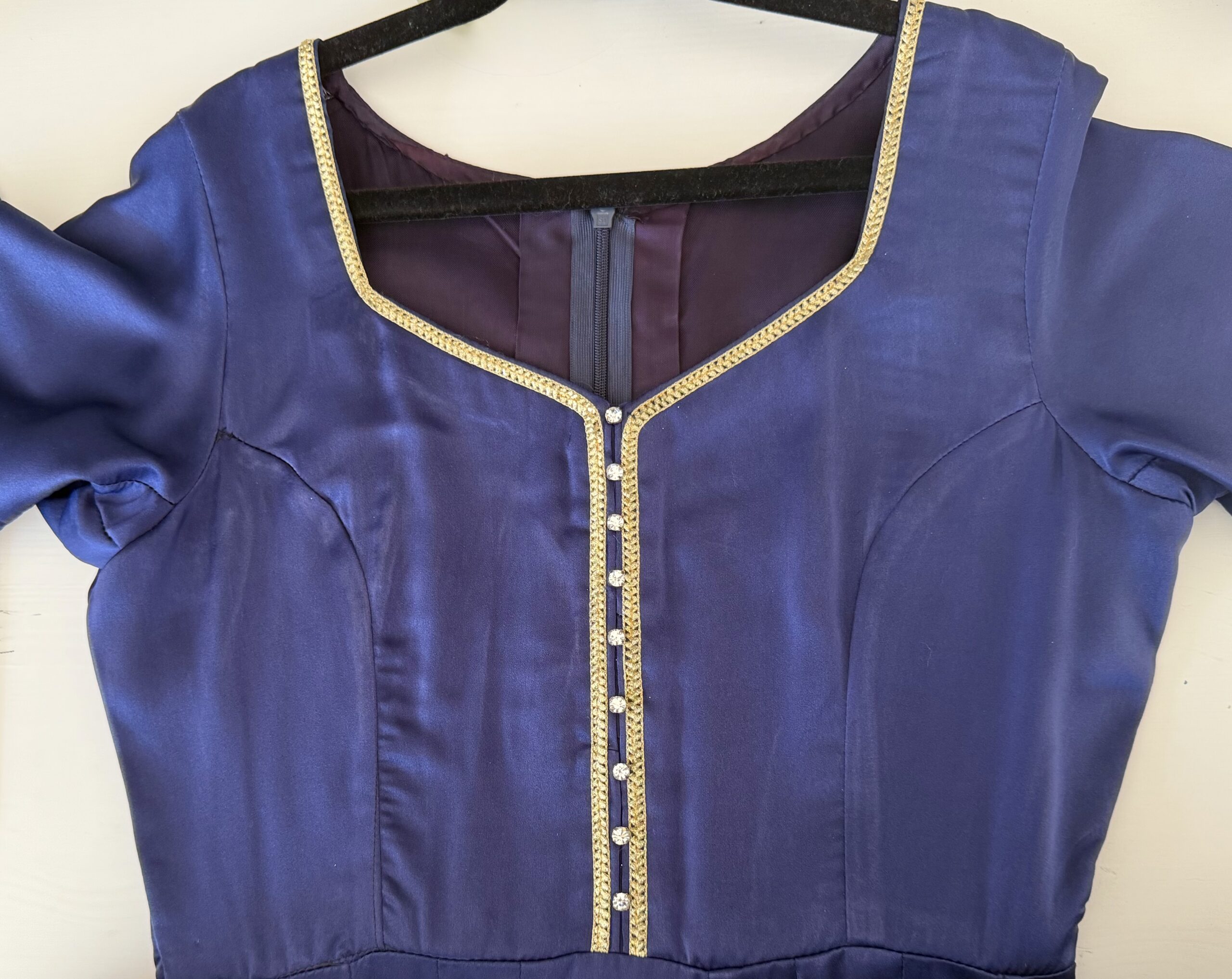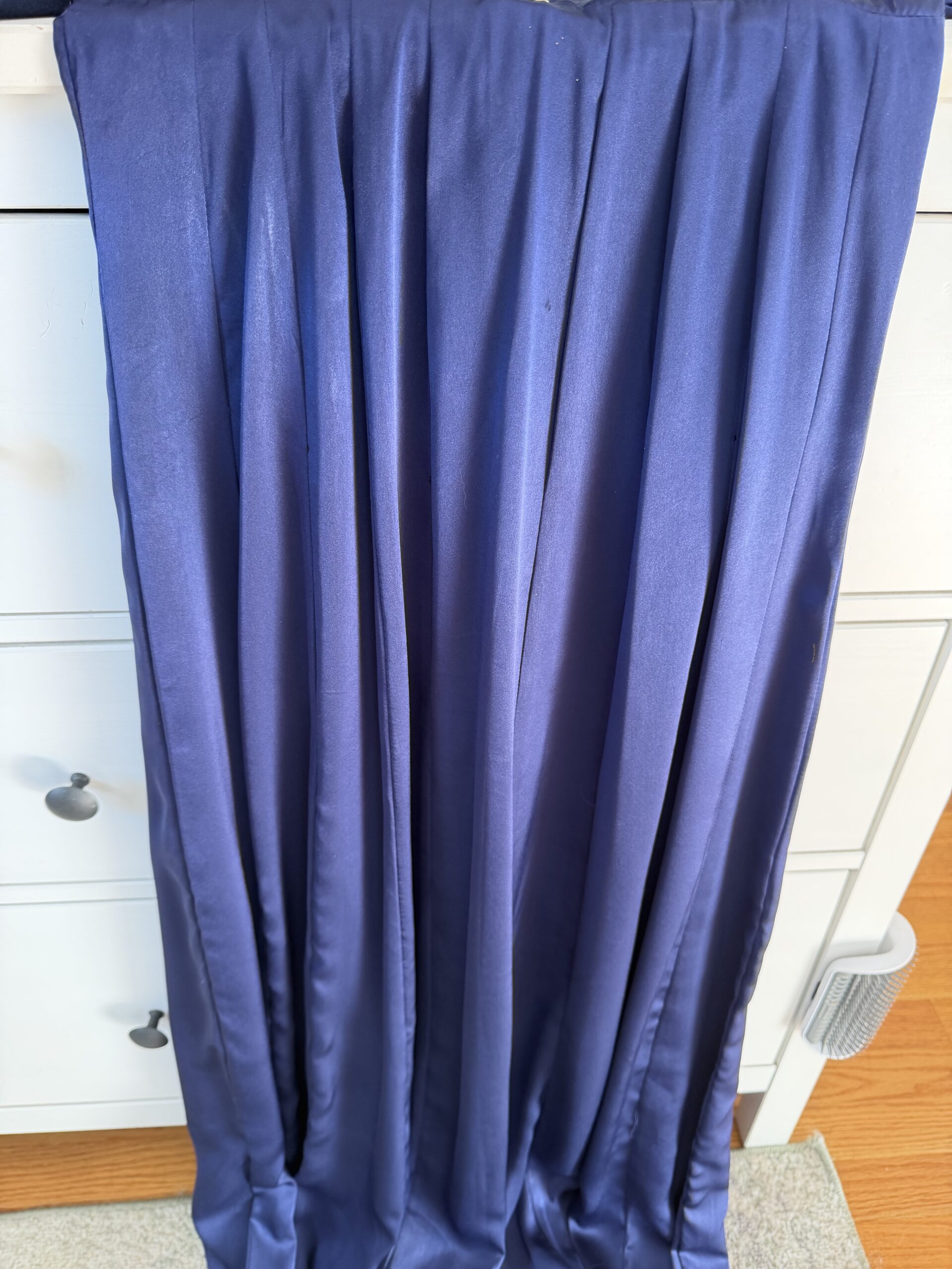 Royal Blue Satin floor length maxi dress. No tag but XS small. Fully functioning zipper in back. Fabric has a pretty sheen to it. Minor spots – close up photo of fabric is attached. Worn 3-4x. Will be freshly dry cleaned prior to shipping.