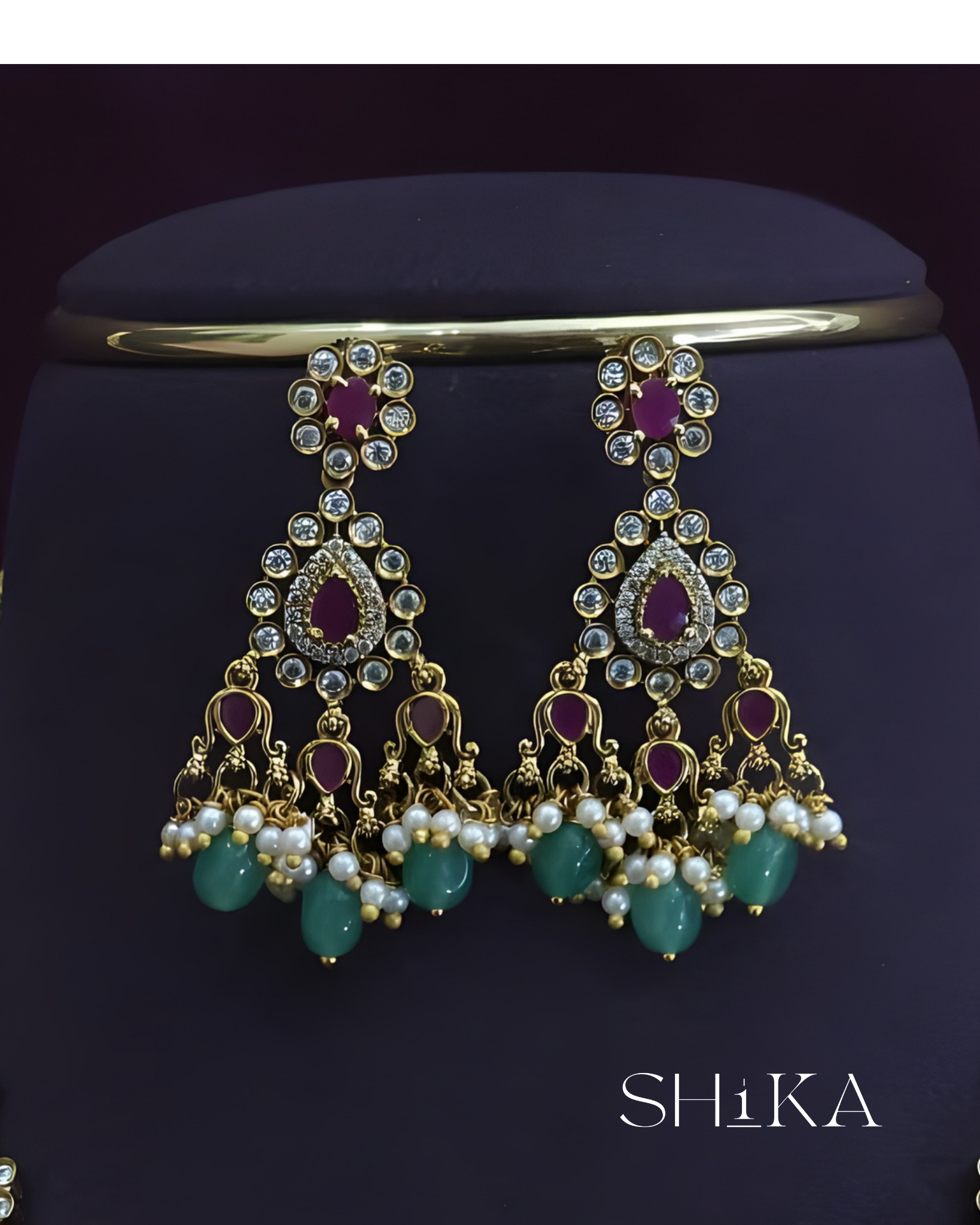 A majestic bridal set with red and green stones, white pearls, and a central pendant with dangling green beads. The earrings echo the teardrop motif, ideal for weddings and grand occasions.