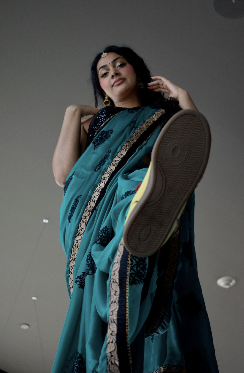 Introducing our Teal Saree, a mesmerizing blend of sophistication and allure, featuring a striking border in bold black and gold accents that frame the fabric with elegance. Enhanced by intricate black patterns throughout, this saree exudes a sense of understated luxury and refinement. Elevate your ensemble to new heights with this exquisite piece, designed to captivate attention and leave a lasting impression at any special event. No blouse included.