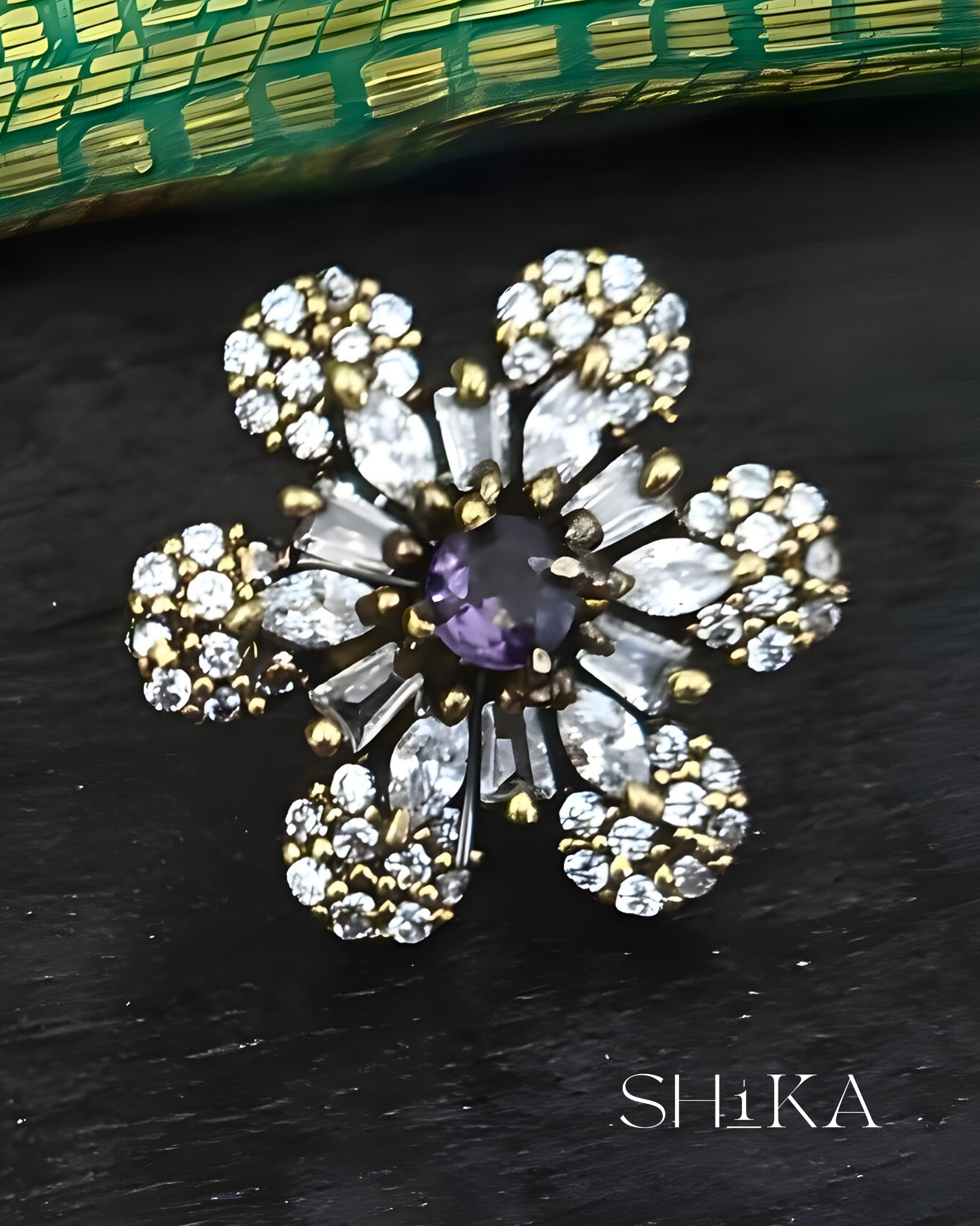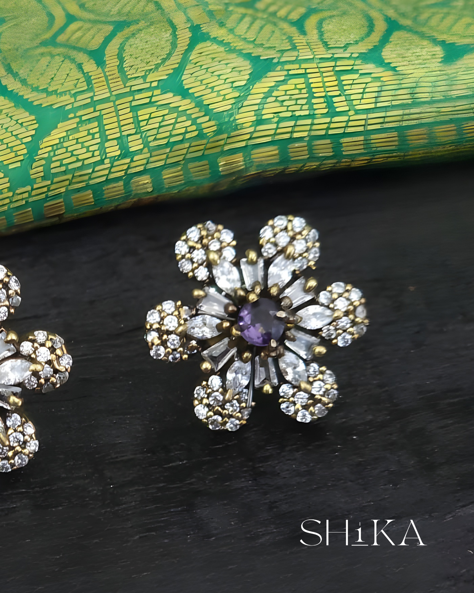 A sparkling pair of Victorian-style earrings that exude timeless elegance. Designed with a central purple stone and surrounded by moissanite petals, these studs are ideal for adding a refined touch to evening wear or bridal looks.