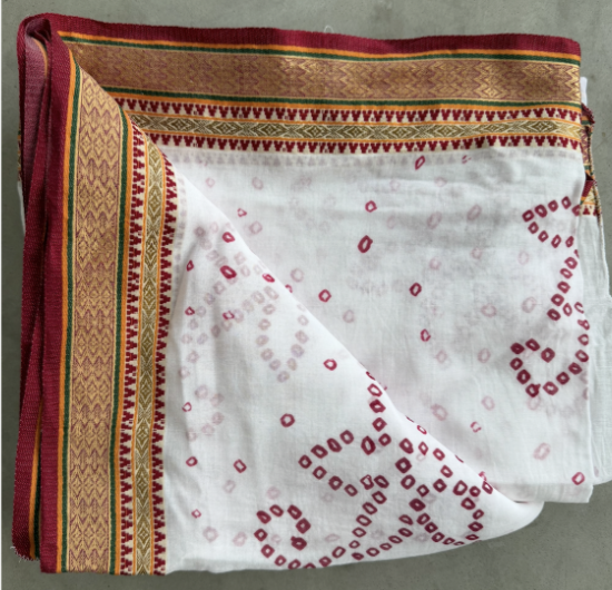 A crisp white saree featuring delicate bandhani-inspired dot motifs in maroon, arranged in playful geometric/floral patterns across the body. Finished with a rich maroon border and an ornate gold zari-style band, accented with slim green and mustard stripes for a classic, festive touch. Lightweight and easy to drape—perfect for poojas, daytime events, and celebrations when you want something traditional yet fresh.