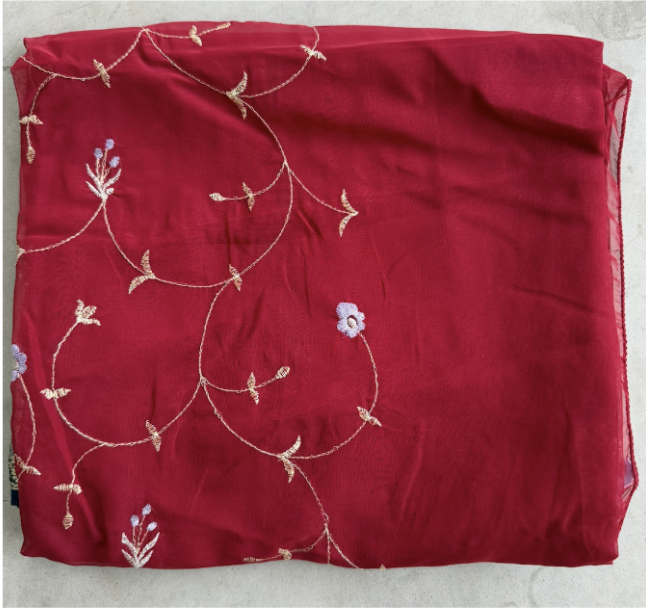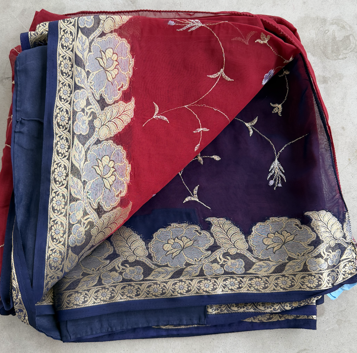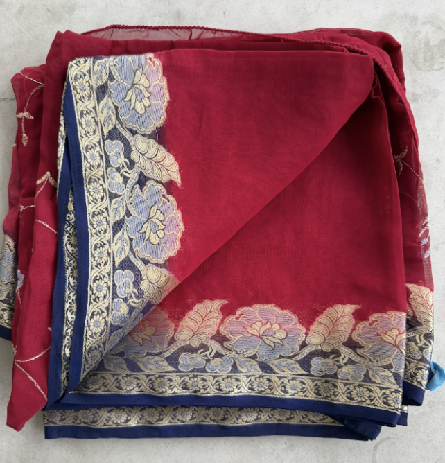 A rich wine-red saree featuring delicate vine embroidery with tiny floral accents scattered across the body for an elegant, minimal shimmer. Finished with a standout navy border detailed in ornate gold floral work that frames the drape beautifully and adds a luxe contrast. A timeless pick for weddings, festive dinners, and evening events—easy to style with gold jewelry and a navy or champagne blouse.